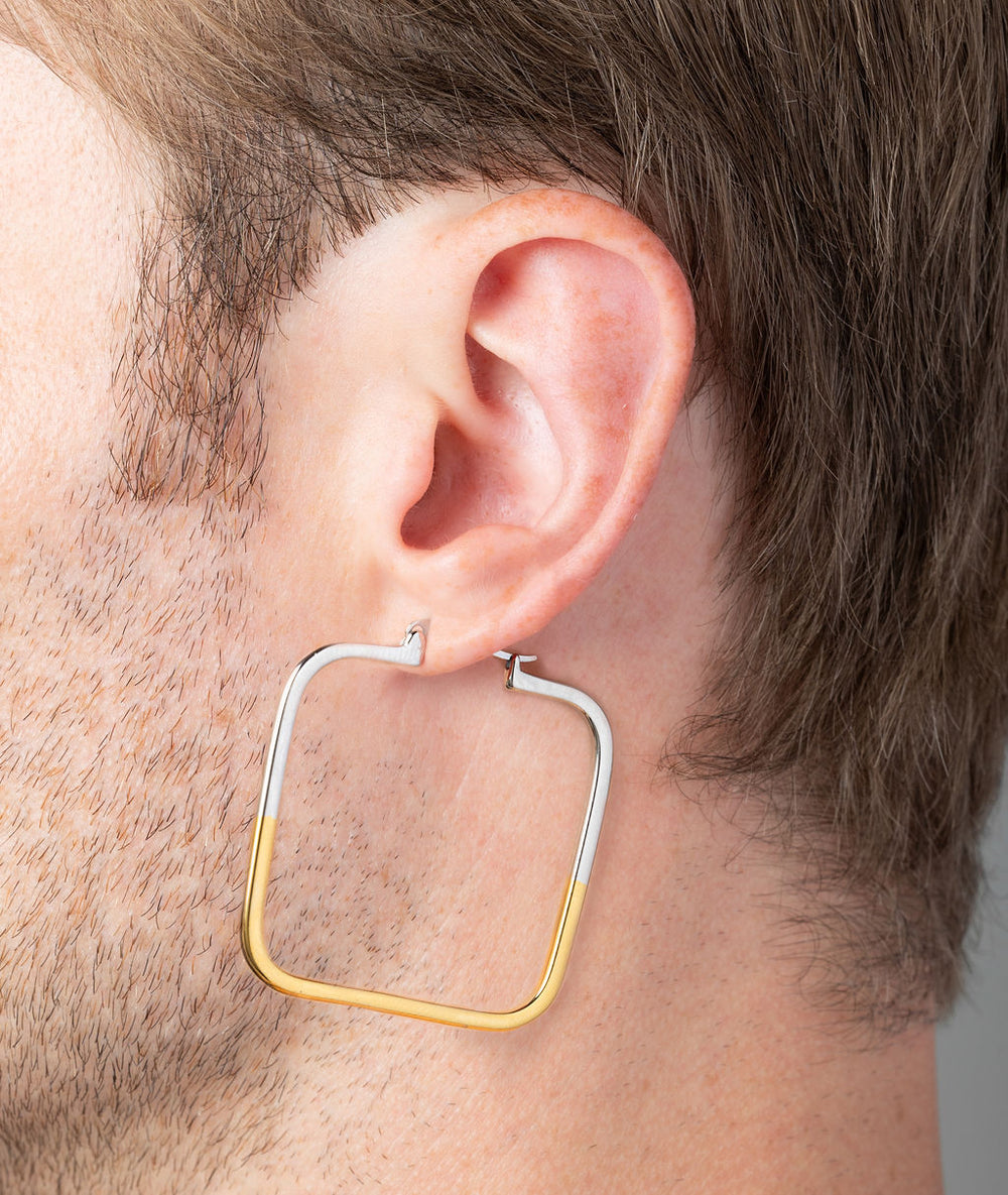 square earring in two-tone gold and silver stainless steel, pierced ear jewellery, comfortable, water-resistant, for men and women, anysex. one size fits all. sold individually.
