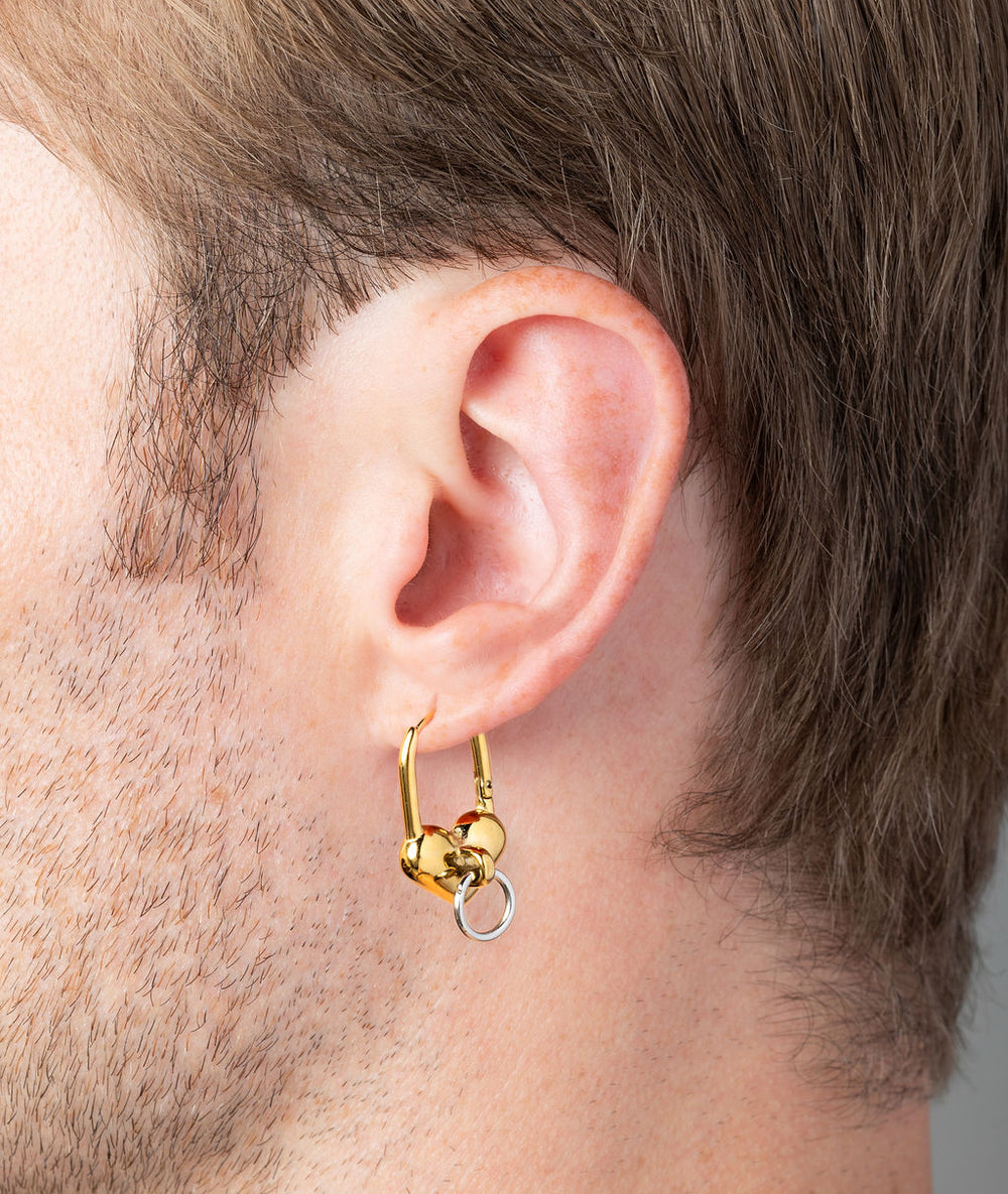 heart-shaped padlock dangle earring in two-tone gold and silver stainless steel, pierced ear jewellery, comfortable, water-resistant, for men and women, anysex. one size fits all. sold individually.