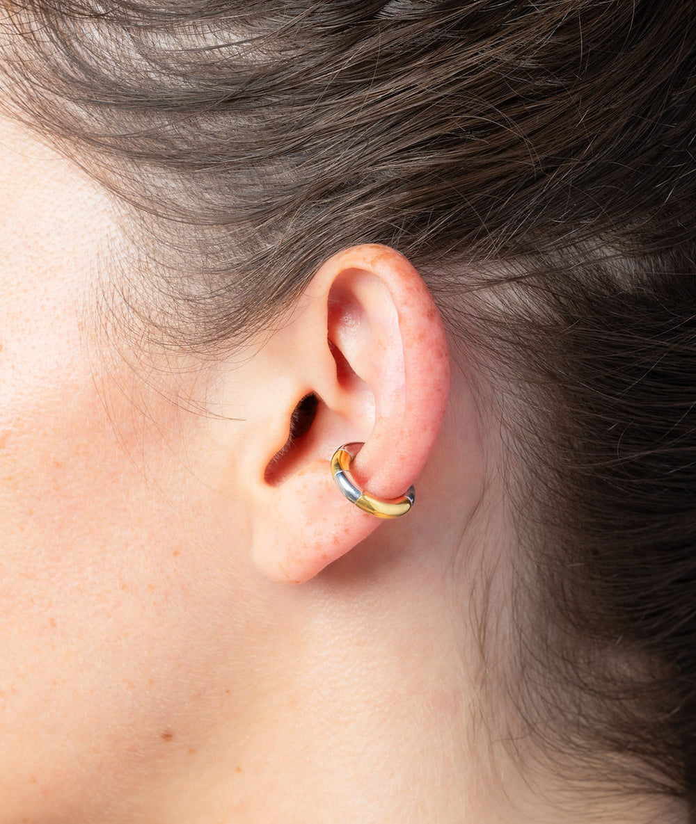 round ear cuff in two-tone stainless steel, non-pierced ear jewellery, comfortable, water-resistant, for men and women, anysex. one size fits all. sold individually.