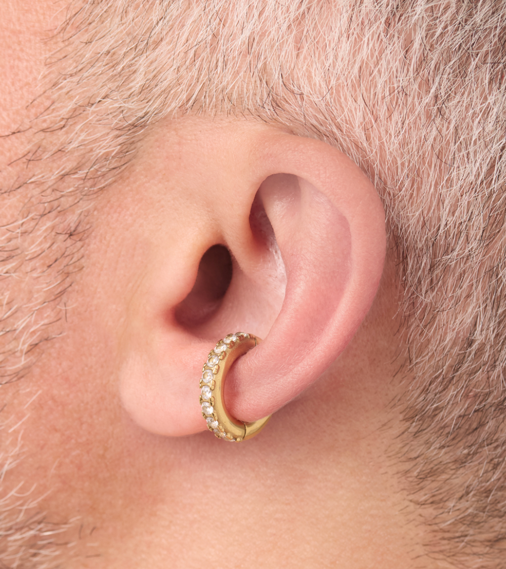gold-plated stainless steel and cubic zirconia ear cuff, non-pierced ear jewelry, comfortable, water-resistant, for men and women, any sex. one size. sold individually.