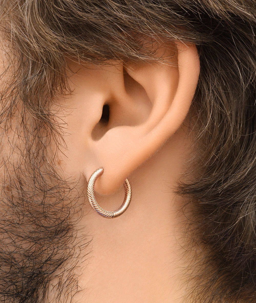boucle d'oreille créole or rose taille xl motif écaillé, diamètre 14mm bijou d'oreille percée, confortable, résistante à l'eau, pour homme et femme, anysex. taille unique. vendue à l'unité.