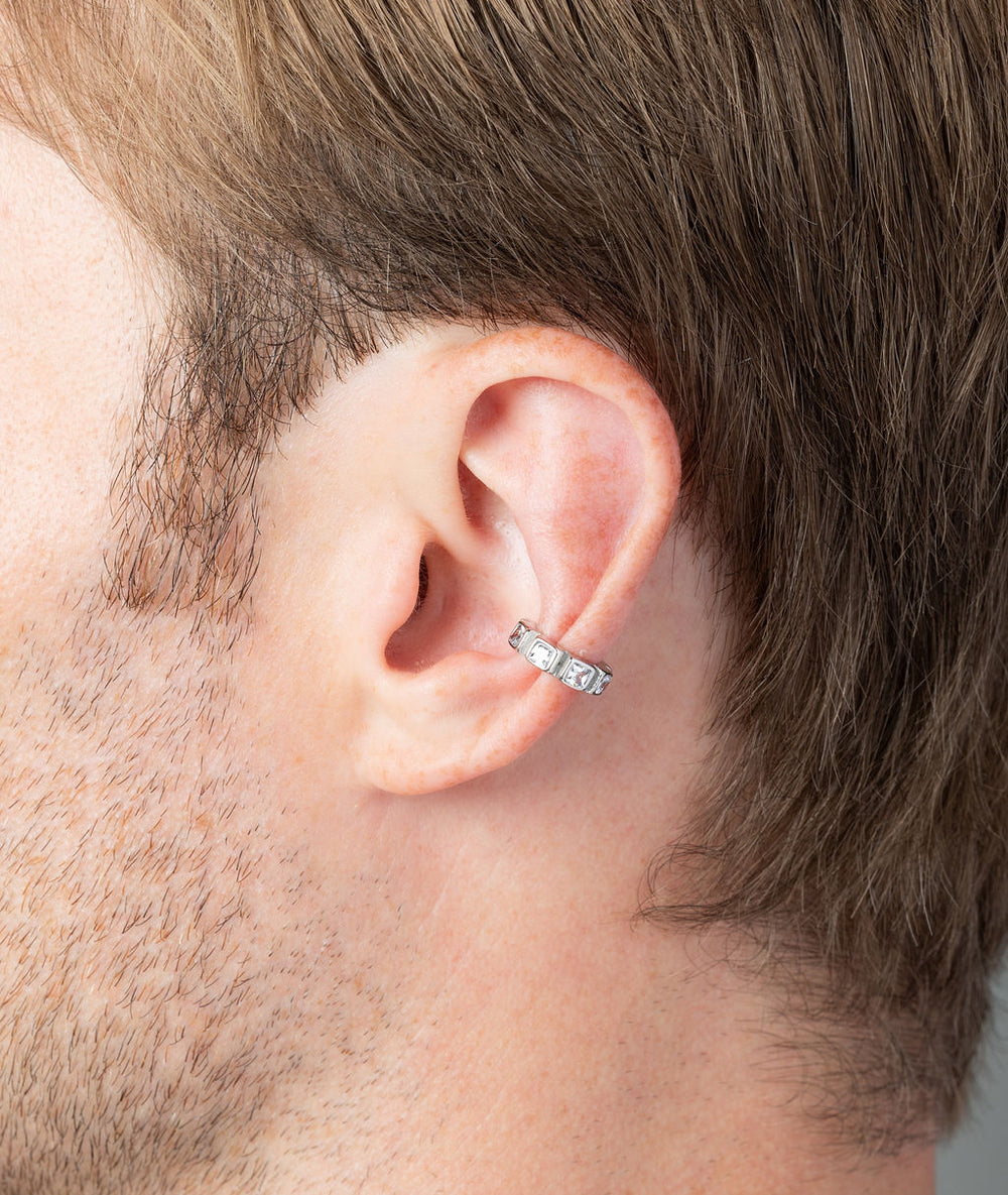 ear cuff en acier inoxydable argenté et oxydes de zirconium, bijou d’oreille sans perçage, bijou confortable, bijou résistant à l’eau, earcuff pour homme, earcuff pour femme, earcuff unisexe, taille unique, vendu à l’unité.